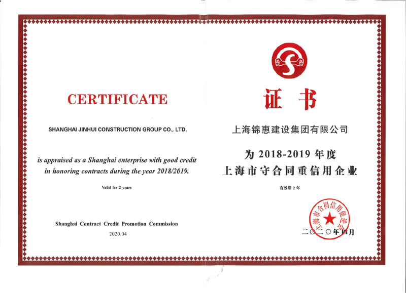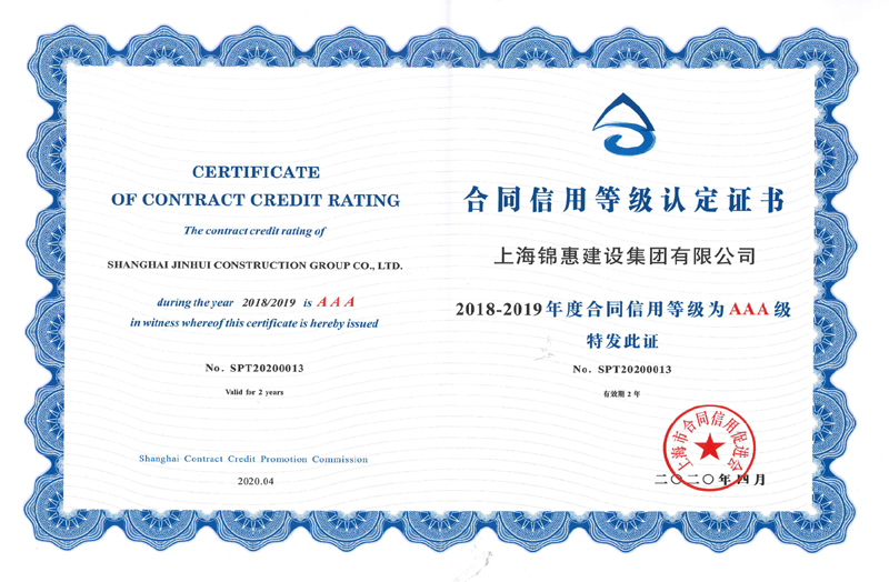 2020年4月,上海錦惠建設集團有限公司獲評“2018-2019年度上海市守合同重信用等級3A級企業(yè)”?! ?/span>
