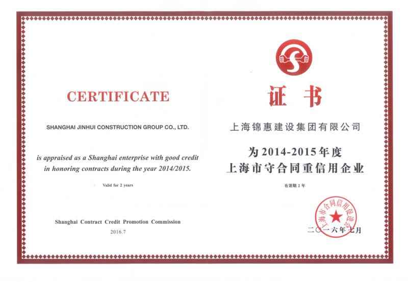 2016年7月,上海錦惠建設集團有限公司被評為2014-2015年度上海市守合同重信用等級3A級企業(yè)。