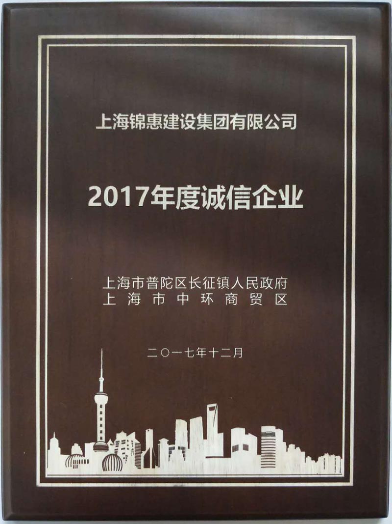 2017年12月,上海錦惠建設集團有限公司再次榮獲上海市普陀區長(cháng)征鎮人民政府頒發(fā)的2017年度“誠信企業(yè)”稱(chēng)號。